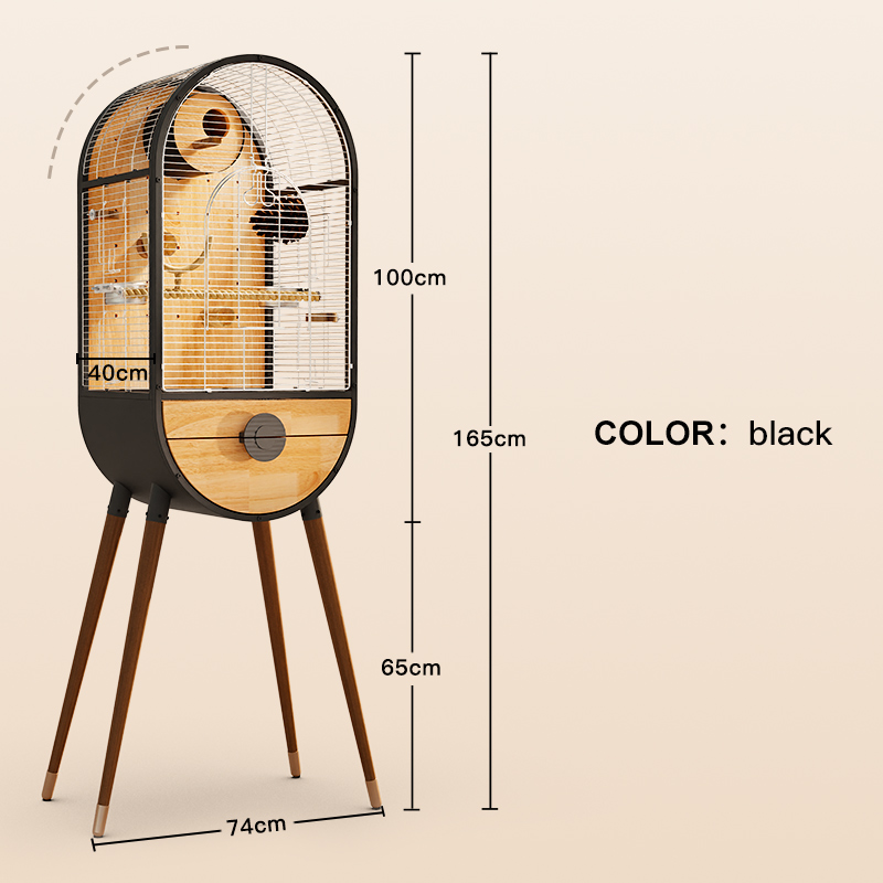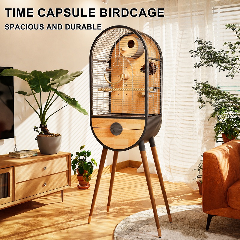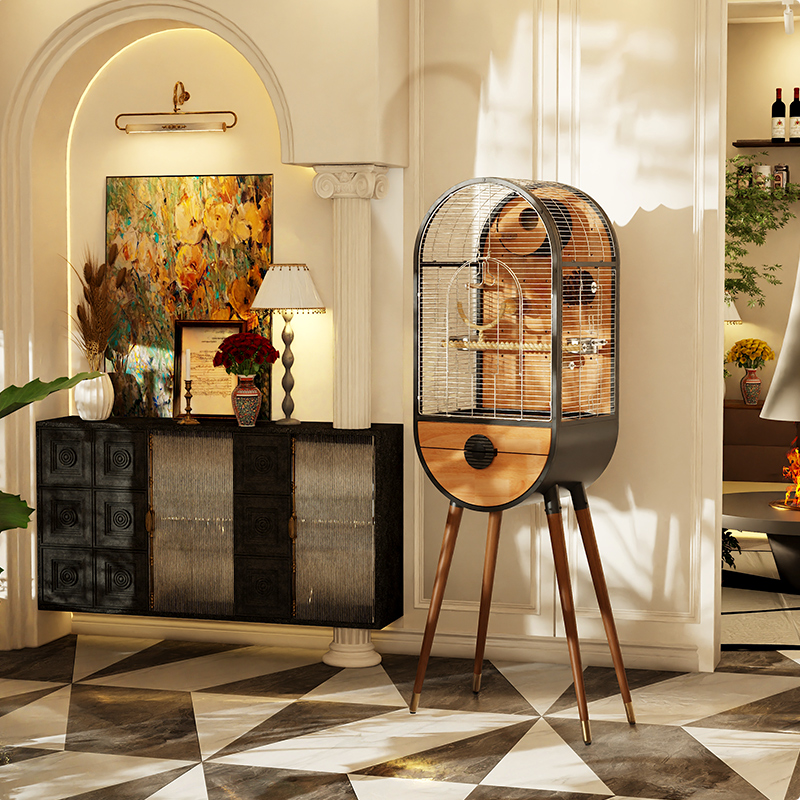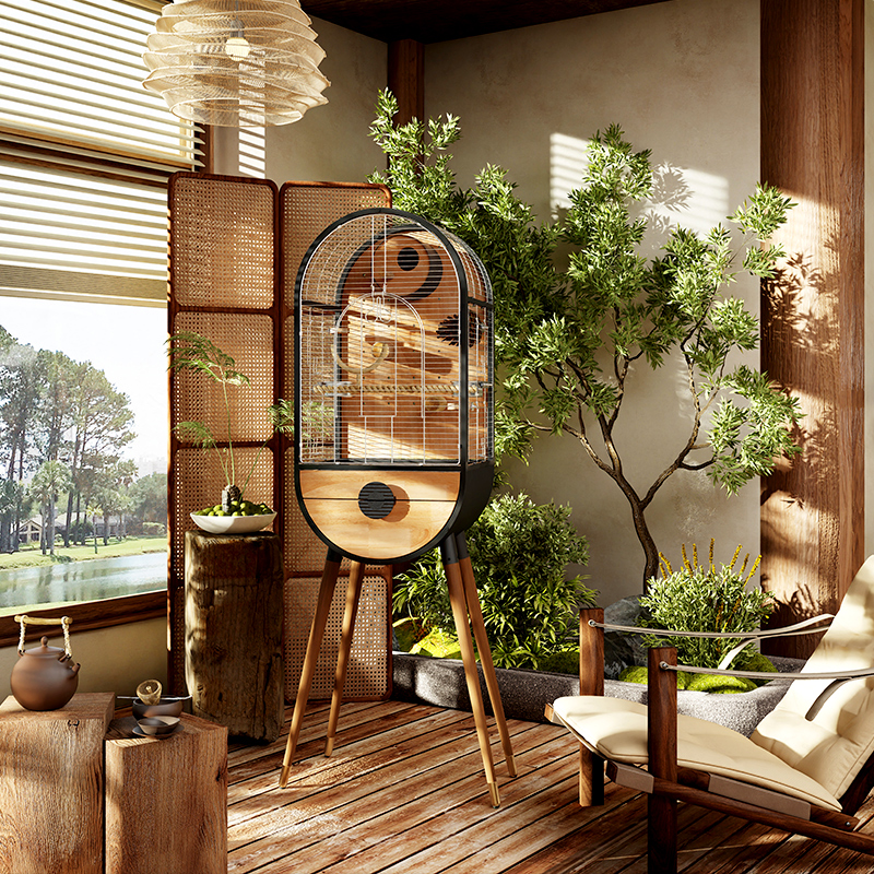 A modern indoor bird cage that balances strength and natural beauty.