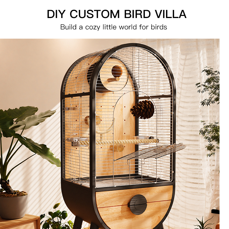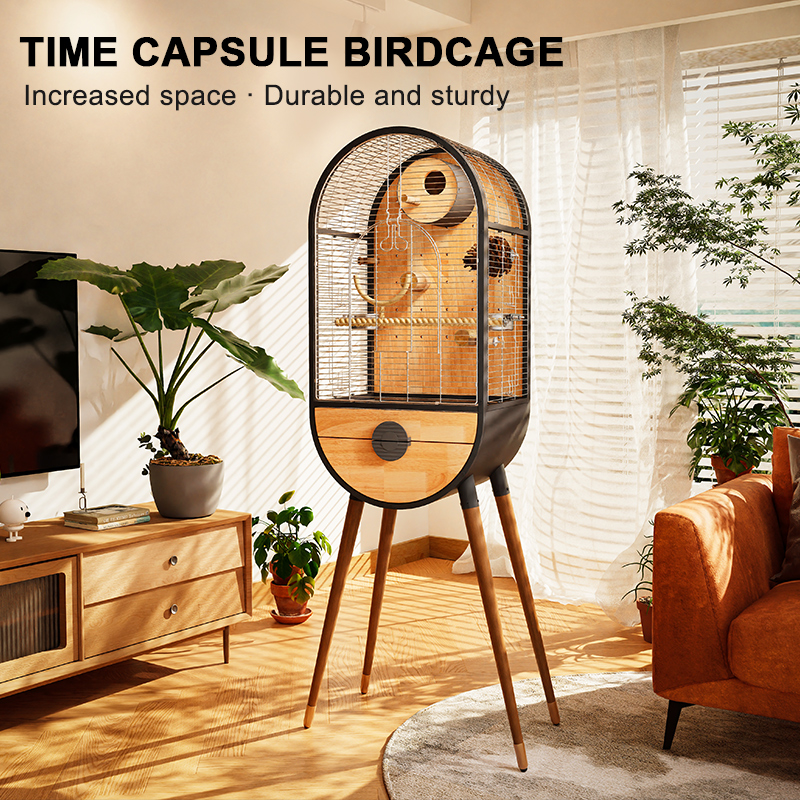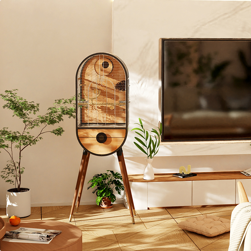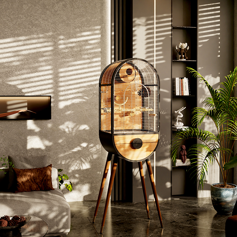 A modern indoor bird cage that balances strength and natural beauty.